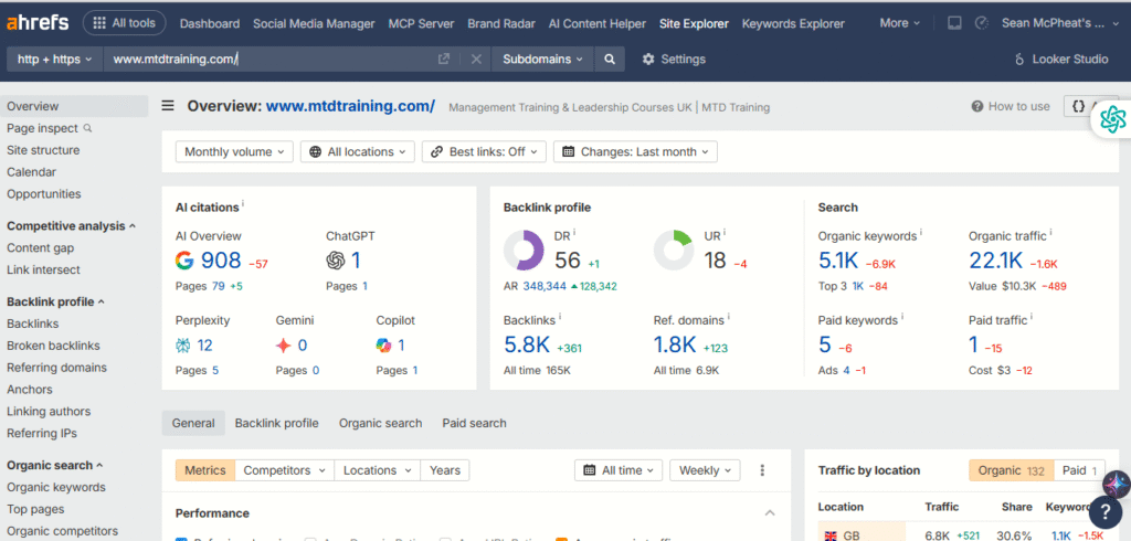 Leveraging a focused backlink strategy, we rapidly built Domain Rating (DR) to 56 and secured 5.8K quality Backlinks from 1.8K Referring Domains, reinforcing the site’s authority. This foundational link-building translated directly into dominant organic performance, driving 22.1K Organic Traffic with a traffic value of $10.3K (in the last month alone, as indicated by the “Changes: Last month” filter). This result confirms our success in translating high-authority backlink acquisition into massive, valuable organic search presence.